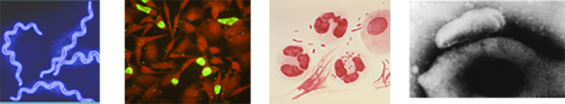 Images de Treponema pallidum en microscopie fond noir, inclusions de Chlamydia trachomatis en microscopie à fluorescence, Neisseria gonorrhoeae en coloration de Gram et Mycoplasma genitalium en microcopie électronique.