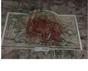 Bas-relief sculpté dans la craie et colonisé par les micro-organismes