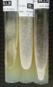 Sur le plan mycologique, la culture de R. arrhizus se fait facilement sur milieux usuels (Sabouraud-gentamicine-chloramphenicol, géloses au sang, géloses polyvitex, etc.). Le champignon pousse à 30°C comme à 37°C. La croissance est rapide et les colonies arrivent à maturité en l’espace de 4-5 jours. Macroscopiquement, les colonies de R. arrhizus envahissent rapidement la gélose et présentent un aspect aérien (jusqu’à 1 cm de hauteur) en « barbe-à-papa ». Initialement de couleur blanche, les colonies deviennent rapidement grises à brun foncé à maturité. On peut observer à l’œil nu un enchevêtrement de filaments blanchâtres au sein duquel se nichent des petits grains foncés (correspondant aux sporanges ou sporocystes) de plus en plus nombreux lors de la maturation du champignon (et responsables du changement de couleur de la culture) (Figure 1).