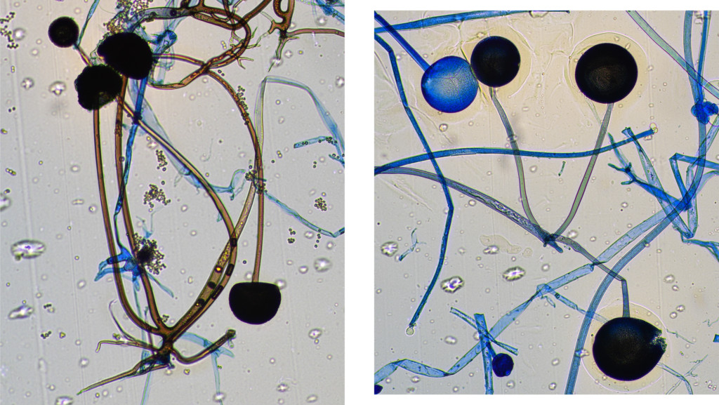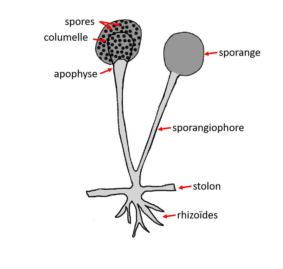 Microscopiquement, les filaments des espèces du genre Rhizopus (dont R. arrhizus) sont larges (6-15 µm de diamètre) et irréguliers ; ils présentent un aspect rubané et ne sont pas (ou très peu) septés (= hyphes siphonnés) (Figure 2). Sur les filaments (ou stolons) se branchent de longs sporangiophores qui portent chacun un sporange produisant des spores brunes arrondies. Les sporangiophores sont isolés ou groupés en verticilles et sont généralement non ramifiés. On observe habituellement des rhizoïdes pigmentés bien identifiables à l’endroit où le/les sporangiophores se séparent du stolon. Les sporanges sont sphériques, de grande taille (50-250 µm, visibles à l’œil nus = grains bruns), et pigmentés. Le sporangiophore se termine par une vésicule de forme arrondie, appelée columelle, qui fait saillie dans le sporange dont elle occupe la majeure partie. Les spores produites sont libérées à maturité par déchirement de la paroi du sporange. Il persiste alors à la base de la columelle une petite cicatrice (appelée collerette, résidu de paroi du sporange) qui permet de visualiser la présence d’une courte apophyse (Figure 3).