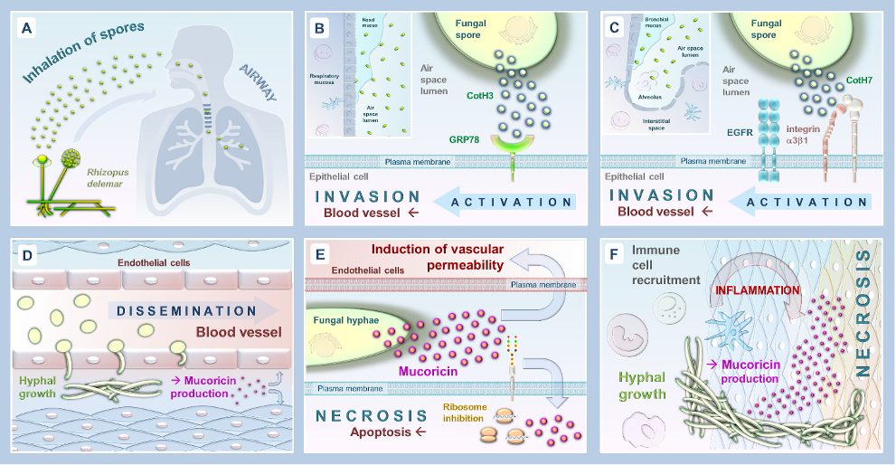 Parmi les champignons les plus dangereux provoquant des infections invasives et mortelles, Candida albicans, Aspergillus fumigatus et Cryptococcus neoformans sont bien connus des cliniciens, des biologistes et des chercheurs. La biologie des infections causées par ces champignons (physiopathologie) est relativement bien documentée, et plusieurs facteurs fongiques ont été identifiés pour expliquer leur virulence. Cependant, il n’en va pas de même pour certains agents fongiques émergents. Compte tenu de la mortalité extrêmement élevée associée à certaines de ces infections, le manque de connaissances sur ces pathogènes constitue un véritable obstacle à l’identification de nouvelles cibles fongiques pouvant être exploitées pour le développement thérapeutique. Parmi les pathogènes fongiques ayant émergé au cours des deux dernières décennies, les espèces de moisissures liées à l’ordre des Mucorales sont particulièrement inquiétantes. Nous avons pu récemment le constater dans le cadre des co-infections avec le SARS-CoV-2 notamment en Inde. À l’échelle de la communauté scientifique, la biologie et la génétique des Mucorales sont mal comprises par rapport aux Ascomycota (incluant la plupart des pathogènes fongiques courant comme Candida albicans ou Aspergillus fumigatus). Cependant, d’un point de vue clinique, les Mucorales sont connus pour provoquer des infections rapidement évolutives au pronostic sombre chez différentes catégories de patients : diabétiques, immunodéprimés (neutropéniques, greffés de cellules souches hématopoïétiques, transplantés d’organe solide), grands brûlés, et patients victimes de plaies traumatiques très délabrantes. La morbi-mortalité est très importante, avec une mortalité de 40 à 100 %, ce qui équivaut à plus de 10 000 décès chaque année. Les caractéristiques les plus frappantes des mucormycoses sont des lésions nécrotiques spectaculaires associées une forte inflammation et une destruction des tissus, sous l’effet de la prolifération des hyphes et de leur invasion des vaisseaux sanguins des organes infectés. Le traitement de ces infections invasives à Mucorales est difficile, non seulement car de nombreuses espèces présentent une faible sensibilité aux antifongiques, mais encore parce que la diffusion et la biodisponibilité de ces derniers sont entravées par la nécrose des sites infectés. Alors que la description clinique des lésions typiques des mucormycoses est aujourd’hui bien définie, la physiopathologie, en particulier les facteurs fongiques impliqués dans l’interaction hôte-pathogène, restait jusqu’à présent largement méconnue. Dans ce contexte, des connaissances majeures ont été acquises grâce à une étude remarquable du groupe de recherche d’Ashraf Ibrahim (de l’université de Californie à Los Angeles) publié dans la revue Nature Microbiology.