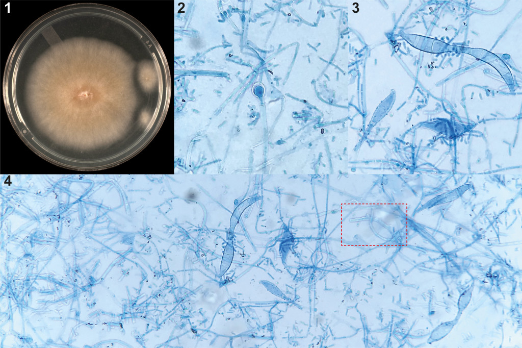 A l’examen microscopique, M. audouini présente des filaments végétatifs hyalins, de diamètre fin et régulier, et cloisonnés. Habituellement aucune sporulation n’est observée sur gélose de Sabouraud, et seule la présence de quelques chlamydospores, terminales ou intercalaires, permet de poser le diagnostic (Figure 2). Certaines souches, moins typiques, produisent néanmoins des spores. Deux types de spores peuvent se voir : des spores pluricellulaires à cloisons transversales appelées macroconidies, et des spores unicellulaires appelées microconidies. Comme pour les autres espèces du genre Microsporum, les macroconidies présentent une paroi échinulée ; elles peuvent évoquer celles de Microsporum canis, avec leur paroi épaisse (> 1 µm), mais elles sont généralement plus longues (7-30 x 35-160 µm), moins rugueuses, et sont souvent déformées avec un aspect en bissac caractéristique (Figures 3 et 4). Les microconidies sont piriformes, et mesurent de 3 à 4 µm de long et 2 à 3 µm de large. Enfin, des organes pectinés ou nodulaires sont parfois présents (Figure 4). Au besoin, le diagnostic peut être confirmé par spectrométrie de masse de type MALDI-TOF, ou par séquençage des régions ITS (internal transcribed spacer) 1 et 2 des ADN ribosomaux.