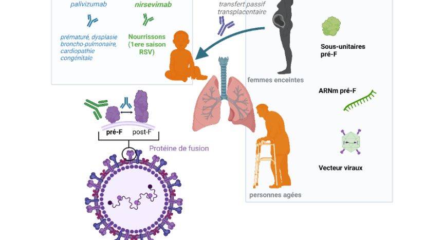 En cette fin d’année marquée par l’intensité de l’épidémie de bronchiolite et les problèmes qui en résultent dans les services de pédiatrie, il est intéressant de constater qu’il y a du mouvement sur le front de la prévention des infections par le RSV. Le développement de stratégies préventives par immunoprophylaxie passive (anticorps monoclonaux, AcM) ou vaccination a bénéficié ces dernières années d’une meilleure connaissance de l’immunité anti-RSV. L’obtention d’une forme stabilisée de la protéine de fusion (protéine F) du RSV en conformation pré-fusion (pré-F) a notamment permis l’identification d’épitopes viraux cibles d’une réponse intense médiée par des anticorps neutralisants (AcN)(Mazur et al. 2022).