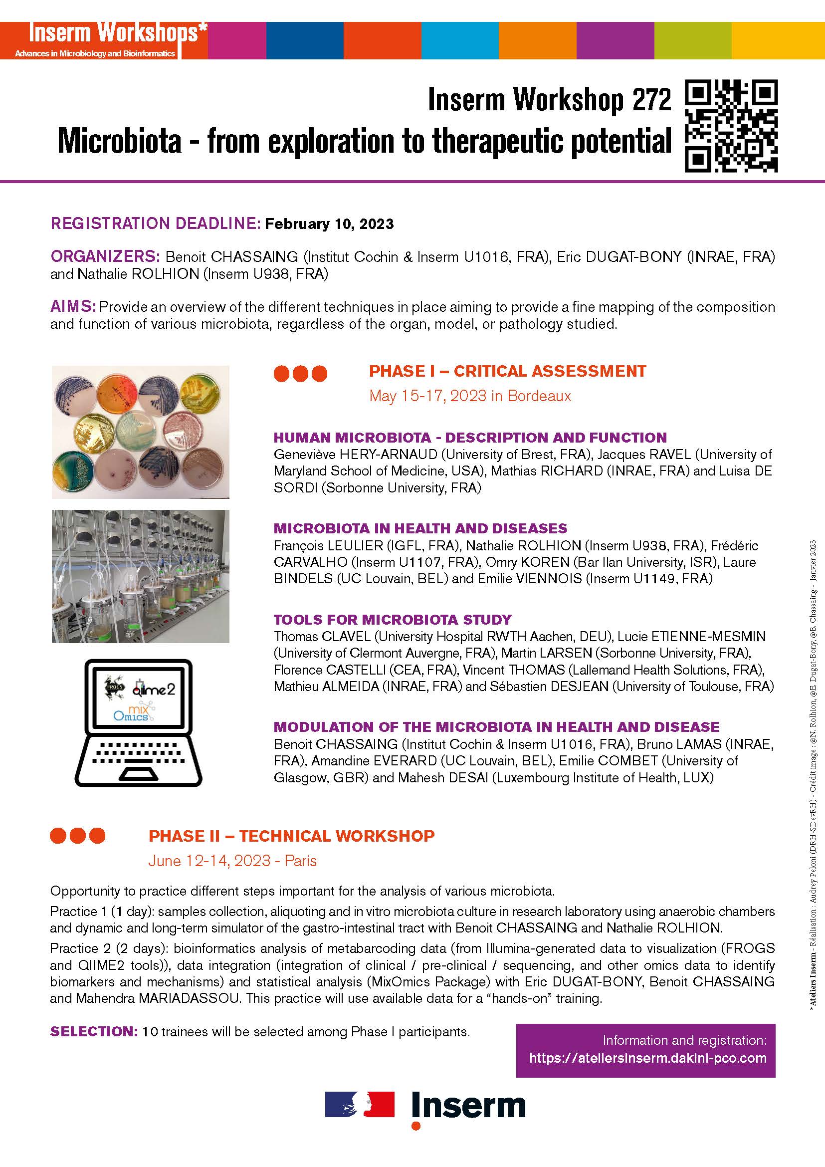 Atelier Microbiote organisé par l’INSERM En savoir plus Partager cet Article Avez-vous aimé cet article ?0 0 Article PrécédentPraticien hospitalier hygiène – Hôpital Raymond Poincaré GarchesArticle suivantOffre emploi ingénieur microbiologie Rennes Vous pouvez aussi aimer 7th ICCMg Conference 24 juin 2022 Création du Groupe de Travail « MicMaC » (Microbiome et Métagénomique Clinique) 4 mars 2021 De l’espoir à l’arnaque : les tests Microbiotes en libre accès 12 novembre 2025 Retour sur la table ronde « Microbiote intestinal » 25 février 2026