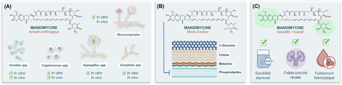 Un autre point remarquable est que la glycosylation de la mandimycine, avec ses trois sucres « désoxy » (une mycosamine et un didésoxysaccharide), confère une haute solubilité qui surpasse d’environ 10 000 fois celle d’une molécule antifongique de structure proche : l’amphotéricine B (Figure C). Cette solubilité élevée représente bien entendu un avantage significatif, car les spécialités polyéniques sont d’une manière générale bien connues pour leur faible solubilité aqueuse, ce qui rend leur formulation difficile et complique leur administration parentérale aux patients. Outre cette solubilité aqueuse exceptionnelle, des expériences in vitro et in vivo montre une néphrotoxicité significativement plus faible de la mandimycine par rapport à l’amphotéricine B, une absence d’effets hémolytiques et des paramètres pharmacocinétiques favorables.