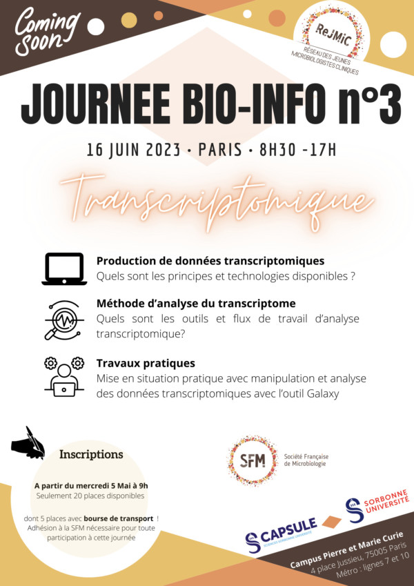 Les inscriptions pour la journée bio-informatique n°3 du ReJMiC sont ouvertes ! N’hésitez pas à candidater aux bourses de transport afin de bénéficier du remboursement de vos frais de déplacement à hauteur de 100 euros (deadline pour la candidature : 19 mai 2023)